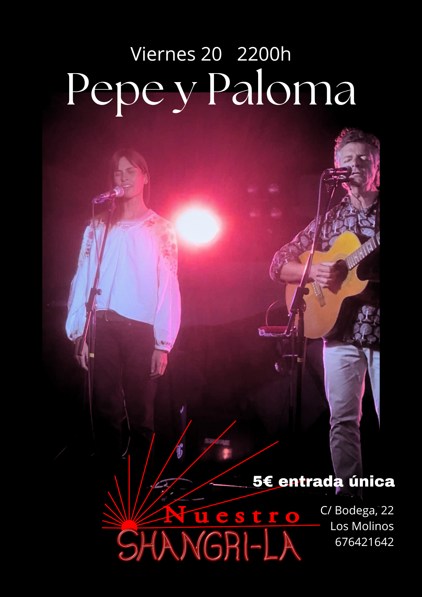Pepe y Paloma forman un dúo de voces que armonizan a la perfección, y que se dejan acompañar muy bien por sus guitarras. Con su buena elección de versiones clásicas y sus temas de composición propia, presentan un repertorio que promete hacer de la noche del viernes un momento repleto de dulzura y belleza. Es una ocasión muy especial para nosotros. Acompáñanos.